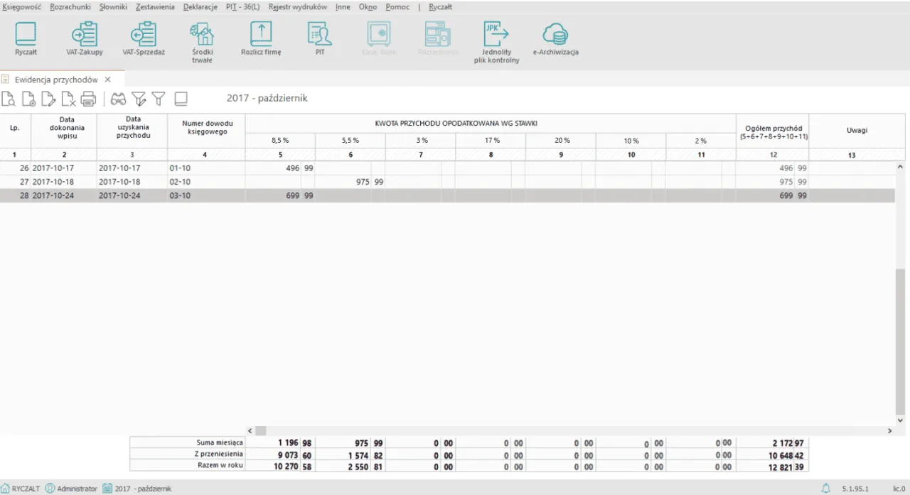 Kolejnym krokiem jest wpisanie wartości przychodu. Należy pamiętać, aby wartość ta odpowiadała kwocie z dokumentu źródłowego, co zapewnia zgodność ewidencji z rzeczywistymi przychodami. Ważne jest również, aby każdy przychód przypisać do odpowiedniej stawki ryczałtu, co jest uzależnione od rodzaju działalności. Na przykład, stawka 17% dotyczy tłumaczy, podczas gdy 15% jest stosowana dla usług fotograficznych.